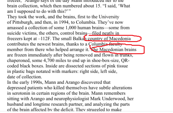 „Ги зеле примероците и мозоците, најпрво на Универзитетот во Питсбург, а потоа, во 1994 година, во Колумбија. Досега имаат собрано колекција од околу 1.000 човечки мозоци — некои од жртви на самоубиство, други контролни мозоци — уредно складирани во замрзнувачи на -112°F. Малата балканска земја Македонија ги придонесува најновите мозоци, благодарение на член на факултетот на Колумбија кој потекнува од таму и помогнал во организацијата. Македонските мозоци се замрзнуваат веднаш по нивното отстранување и се транспортираат во сандаци, под надзор, околу 4.700 милји, за да завршат во црни кутии со големина на кутија за чевли, обележани со QR-кодови. Внатре се наоѓаат исечени делови од розево ткиво во пластични кеси, означени со маркери: десна страна, лева страна, датум на собирање“, се наведува во мејлот, испратен до Епштајн од лице чие име е целосно цензурирано.