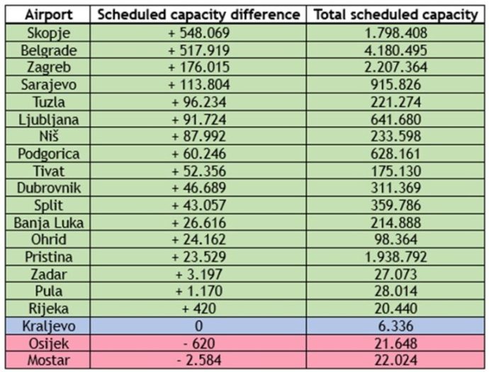 Според порталот, речиси сите аеродроми во поранешна Југославија го зголемуваат својот расположлив капацитет во споредба со минатата година. Авиокомпанијата „Виз Ер“ ќе биде носител на растот во регионот, зголемувајќи го капацитетот за 453.636 седишта во Скопје и 315.817 во Белград.