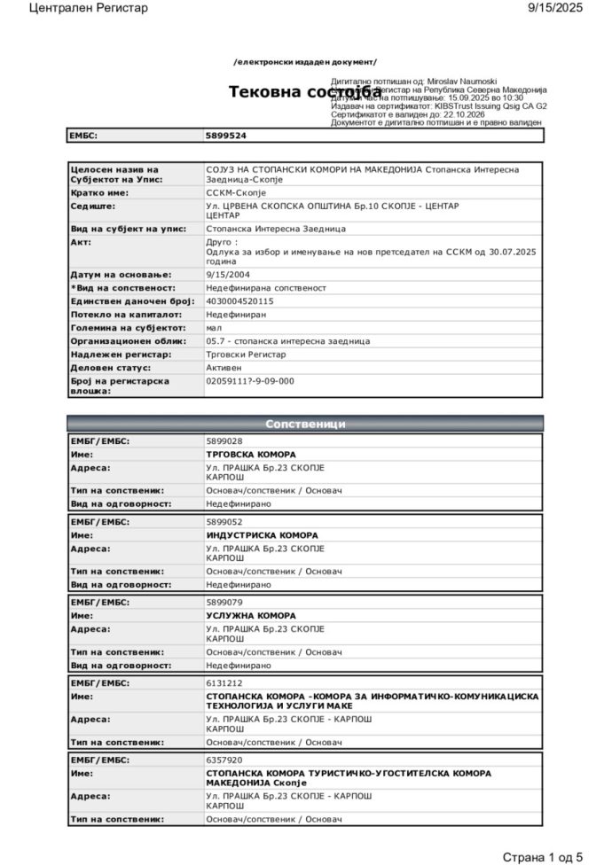 Сојузот на стопански комори од денеска со нов претседател. Централниот регистар на Македонија го заведе Горан Ѓорѓевски како нов прв човек на оваа Комора.