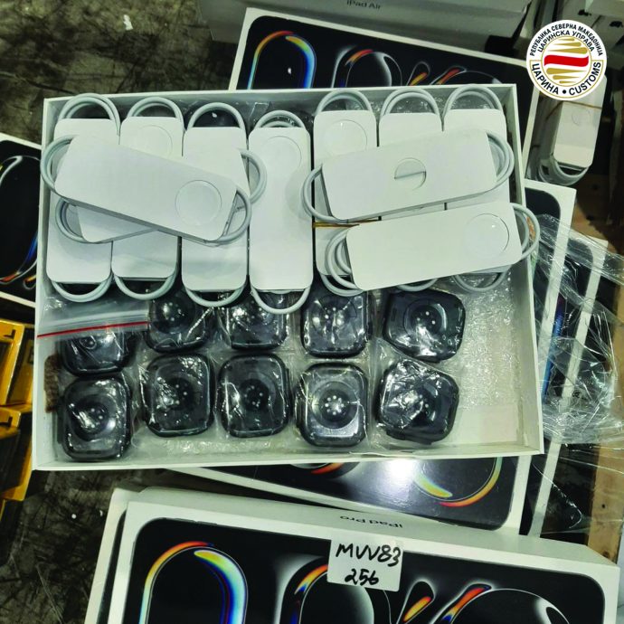 -Мобилен царински тим во царинската испостава Меѓународен Аеродром Скопје при контрола на стока пријавена за увозно царинење од испраќач од Дубаи наменета за македонска фирма откри 20 паметни рачни часовници Apple watch ultra и 11 кабелчиња за полначи во вкупна вредност од 680 илјади денари, кои не биле опфатени со царинските документи.