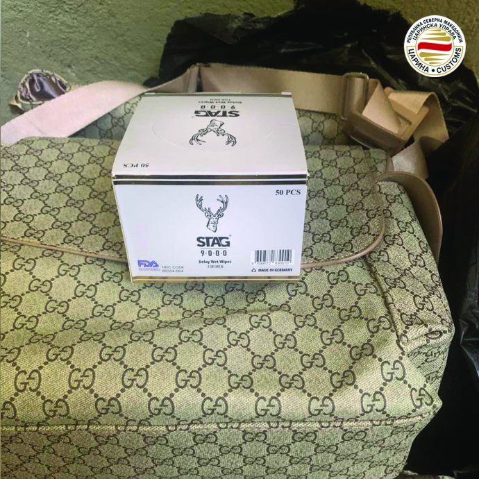 -Мобилен царински тим во соработка со полициски службеници од МЕКМ – ОГРМ запленија 13 кутии со по 50 ќесички влажни шамивчиња за потенција и четири женски чанти со потпис на „Гучи“. Непријавените производи се пронајдени при контрола на автобус кој сообраќал на линијата Турција – Косово.