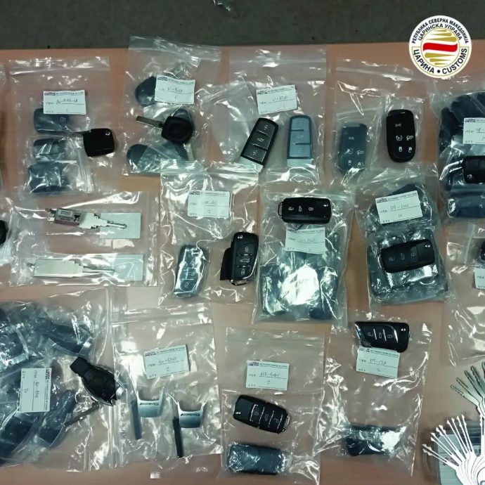 – Откриени се и 183 клучеви за возила и 98 делови и уреди за декодирање на клучеви на Меѓународниот аеродром Скопје во патните торби на државјанка на Косово која допатувала со лет од Виена. 123 парчиња автоделови се пронајдени под задното седиште и во просторот за резервна гума на комбе со бугарски регистарски таблички, а управувано од македонски државјанин, на влез во државата на граничниот премин Делчево, информираат од Царинската управа.
