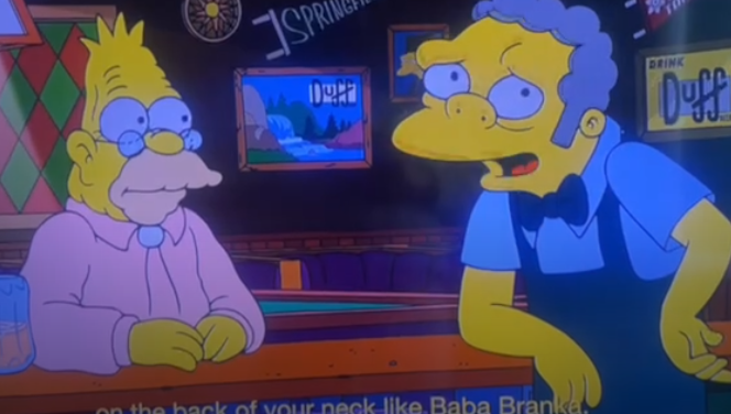 „Ти си копија на татко ти!“ Ова се првите зборови на македонски јазик во „Симпсонови“. Ги изговара ликот на баба Бранка, баба на шанкерот и сопственик Мо, додека тој е бебе.