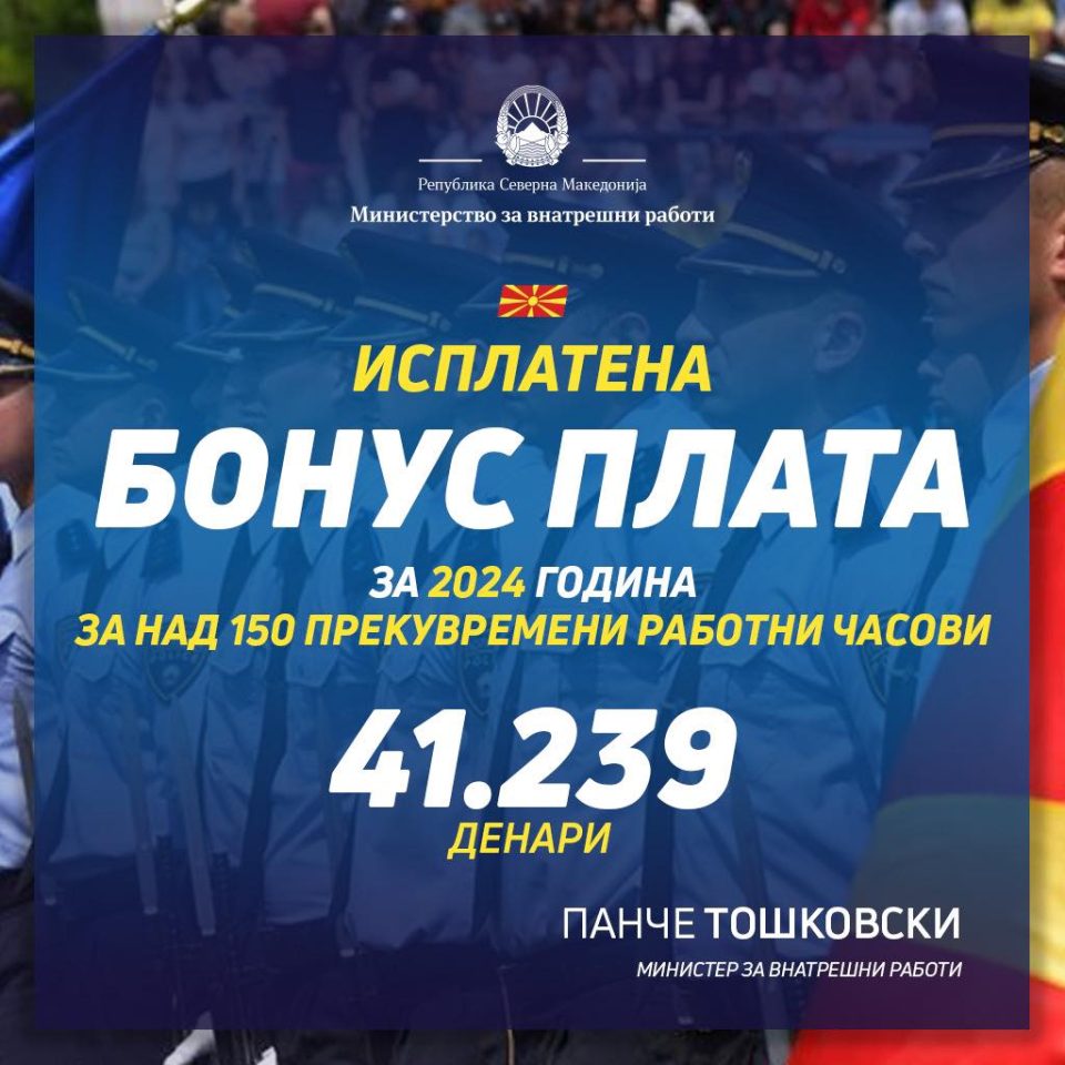 Денеска на 6.241 вработени во Министерството за внатрешни работи, кои оствариле над 150 часа прекувремена работа во текот на 2024 година им беше исплатена бонус плата во поединечен нето износ од 41.239 денари. Сите средства се обезбедени од буџетот на Министерството за внатрешни работи, објави на социјалната мрежа на Фејсбук министерот за внатрешни работи Панче Тошковски.