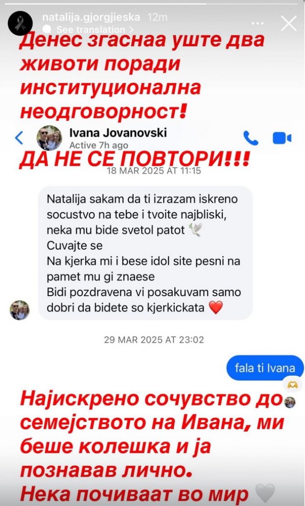 -Денес згаснаа уште два животи поради институционална неодговорност. Да не се повтори! Најискрено сочувство до семејството на Ивана, ми беше колешка и ја познавав лично. Нека почиваат во мир, напиша Наталија на Фејсбук.