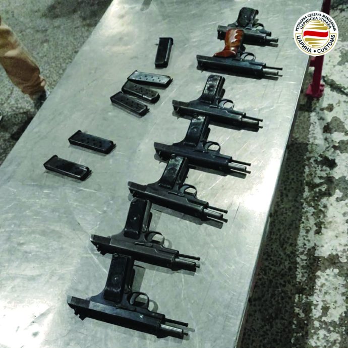 Спречен e обид за сериозен меѓународен криминал, при што запленети се девет пиштоли од кои пет со голема пробивна моќ, а едно лице, македонски државјанин, е лишено од слобода и се наоѓа во притвор, соопшти Царинската Управа.