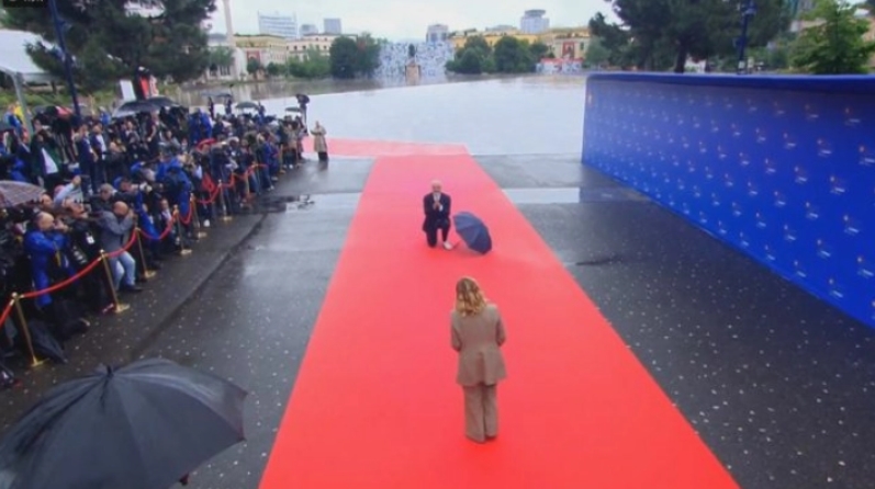 Италијанската премиерка Џорџа Мелони беше дочеканасо голема љубезност од премиерот Еди Рама, кој исто така покажа гест на учтивост кон неа со отстранување на чадорот и клекнување на колена.
