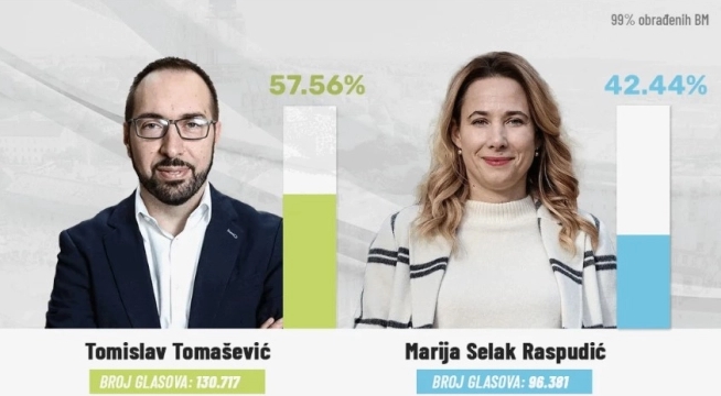Според резултатите со 100 проценти обработени гласачки места, Томашевиќ добил 57,56 проценти од гласовите во вториот круг од локалните избори, додека независната кандидатка Марија Селак Распудиќ добила 42,44 проценти од гласовите.