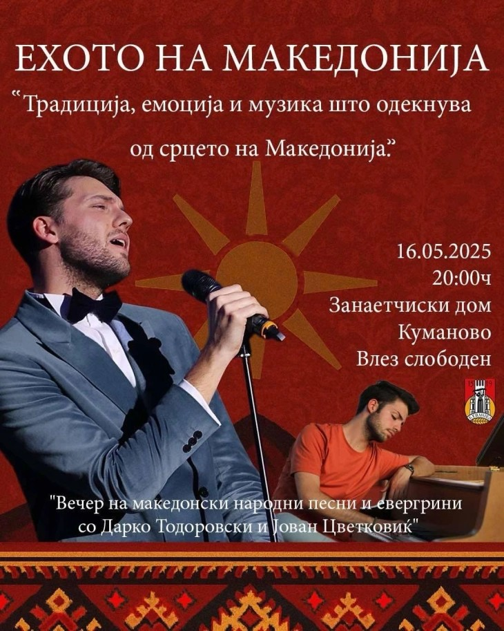 „Ехото на Македонија“ е насловен концертот во кој ќе уживаат кумановци во изведба на вокалниот солист Дарко Тодоровски со пијано придружба на Јован Цветковиќ, информираа денеска организаторите од Фондацијата за култура.