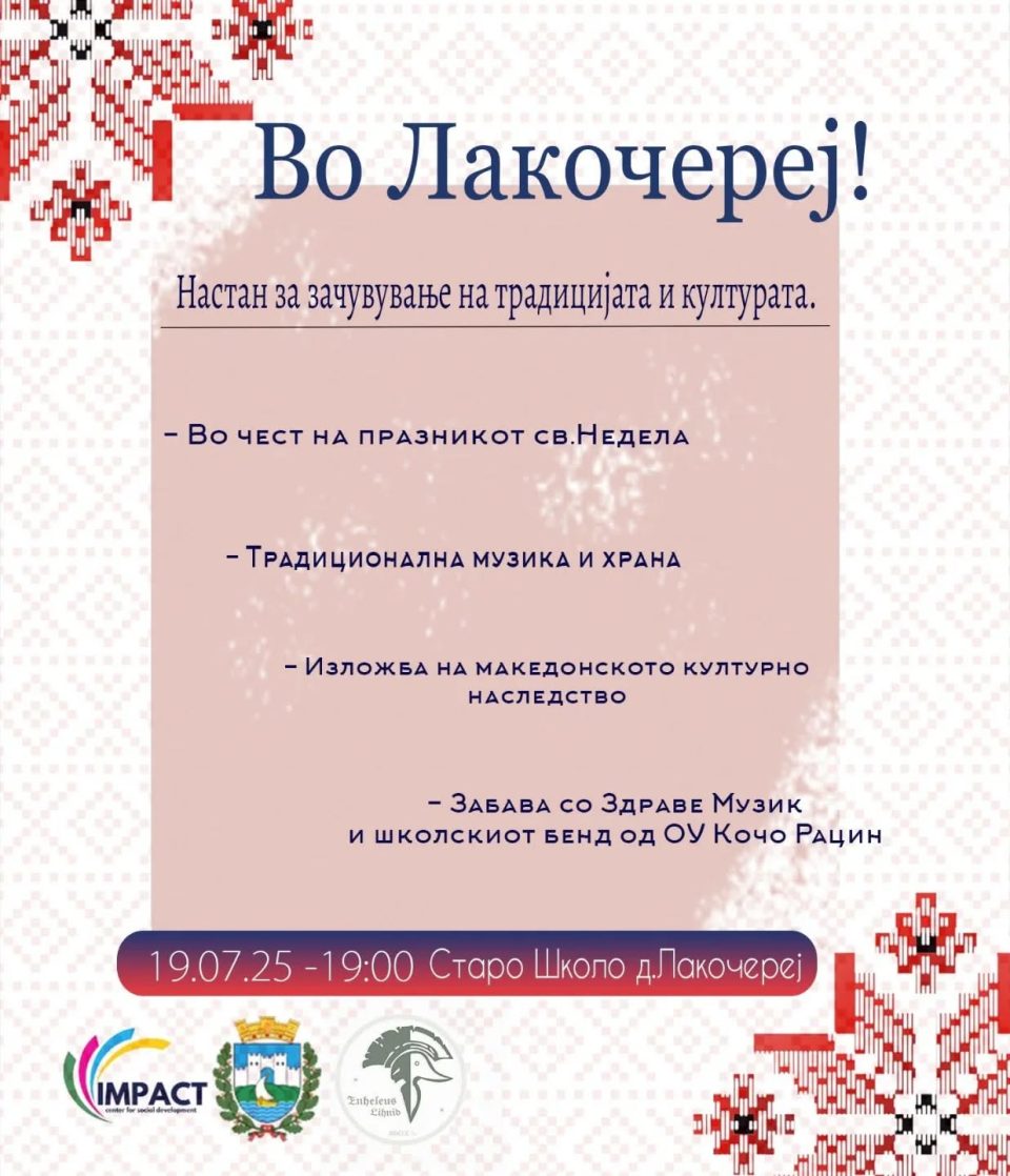 Во чест на празникот св. Недела, заедно со Центарот за Оштествен Развој – Импакт од Охрид, ве покануваме на настанот за зачувување на традицијата и културата во д.Лакочереј, Охрид, соопшти Здружение за заштита на природните и националните богатства Енхелеус Лихнид.