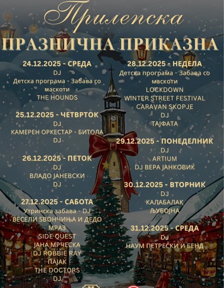Објавена е програмата за годинашното издание на „Прилепска празнична приказна“, настан кој оваа зима ќе го претвори градот во вистинска празнична сцена, исполнета со светлина, музика, детска радост и заедништво.