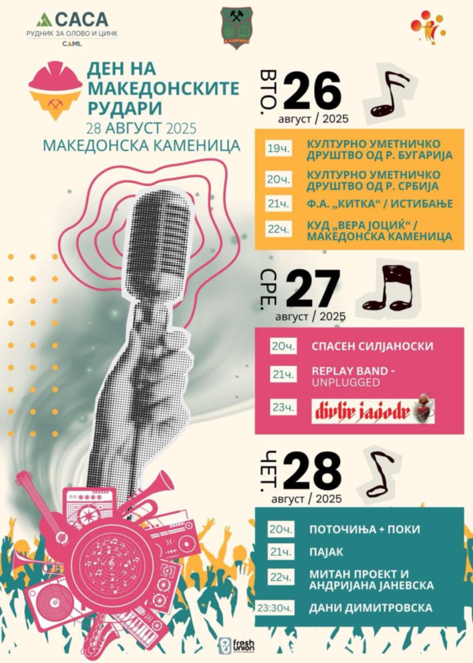 Македонска Каменица и оваа година со гордост го одбележува Денот на рударите – 28 август, со тридневна културно-музичка програма што ќе ја претвори градската сцена во центар на традицијата, современите звуци и незаборавните емоции. Организатори на прославата се Општина Македонска Каменица и Културно-информативниот центар „Романса“, а настанот е под покровителство на Рудникот „Саса“, кој со години ја поддржува оваа значајна прослава на рударскиот труд, заедништво и гордост.
