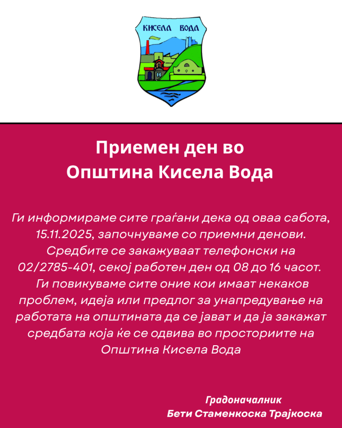Во насока на транспарентно и отчетно работење, како и со цел директно да се слушнат и навремено да се одговара на потребите на граѓаните, градоначалничката на Општина Кисела Вода, Бети Стаменкоска-Трајкоска, од оваа сабота започнува со приемни денови за граѓаните. На овој начин се воспоставува отворена и непосредна комуникација со жителите на Кисела Вода, која ќе придонесе за поефикасно решавање на нивните проблеми и унапредување на квалитетот на живот во општината.