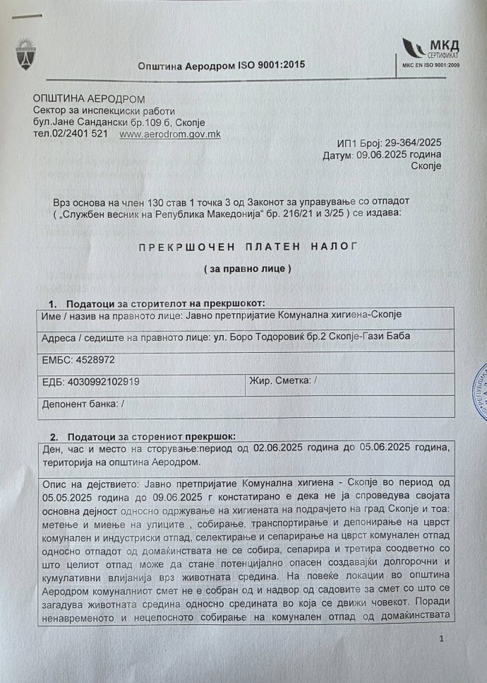 По долг период на трпение и многубројни укажувања, Општина Аеродром изрече прекршочна казна во износ од 88.000 евра на ЈП „Комунална хигиена – Скопје“ поради континуирано нефункционирање, несоодветно собирање отпад и негрижа за јавната хигиена на нејзината територија.