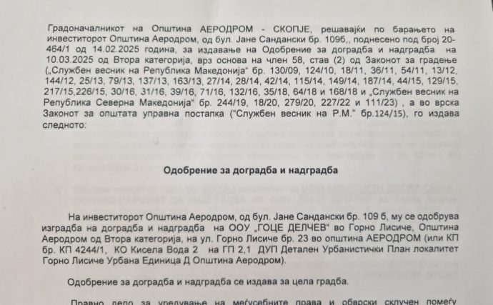 Општина Аеродром издаде одобрение за доградба и надградба на ООУ „Гоце Делчев“ во Горно Лисиче и со овој проект веќе е аплицирано на вториот јавен повик од Владата за финансиска поддршка на општините за реализација на инфраструктурни проекти.