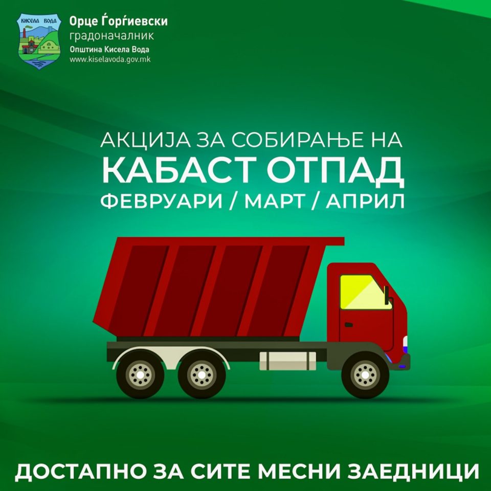 Општина Кисела Вода од денеска до 20 април ќе спроведува акција за бесплатно собирање кабаст и електронски отпад. Акцијата ќе ја реализира во соработка со Министерството за животна средина, како дел од Акцискиот план на Владата за почист воздух.