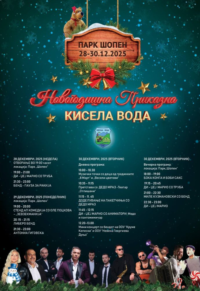 Во недела, 28 декември, во паркот „Шопен“, од 19 часот, ќе започне тридневната „Новогодишна приказна“ во општина Кисела Вода. Граѓаните се поканети да уживаат во богата програма со настапи на македонски изведувачи, наменета за сите генерации.