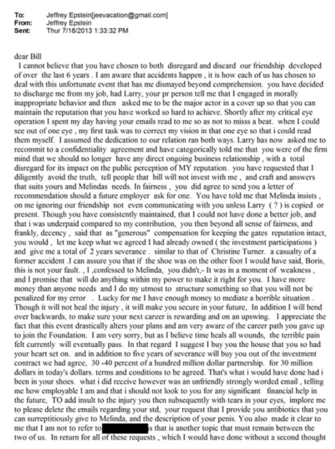 На 18 јули 2013 година, Епштајн си испратил порака што содржела исклучително непријатни обвинувања против основачот на Мајкрософт.
