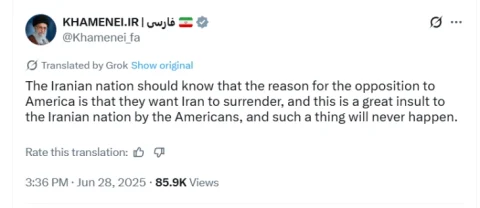 Иранскиот врховен лидер, ајатолах Али Хамнеи, денеска преку објава на Х порача дека исламската нација „никогаш нема да им се предаде на Соединетите Американски Држави“.