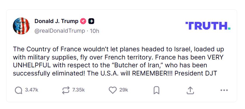 „Франција не дозволи авионите што се упатуваа кон Израел да летаат над нејзина територија. Франција не ни помогна и го почитуваше „касапот на Иран“ кој беше успешно елиминиран. Соединетите Американски Држави ќе го запомнат ова“, напиша Трамп претходно истиот ден.