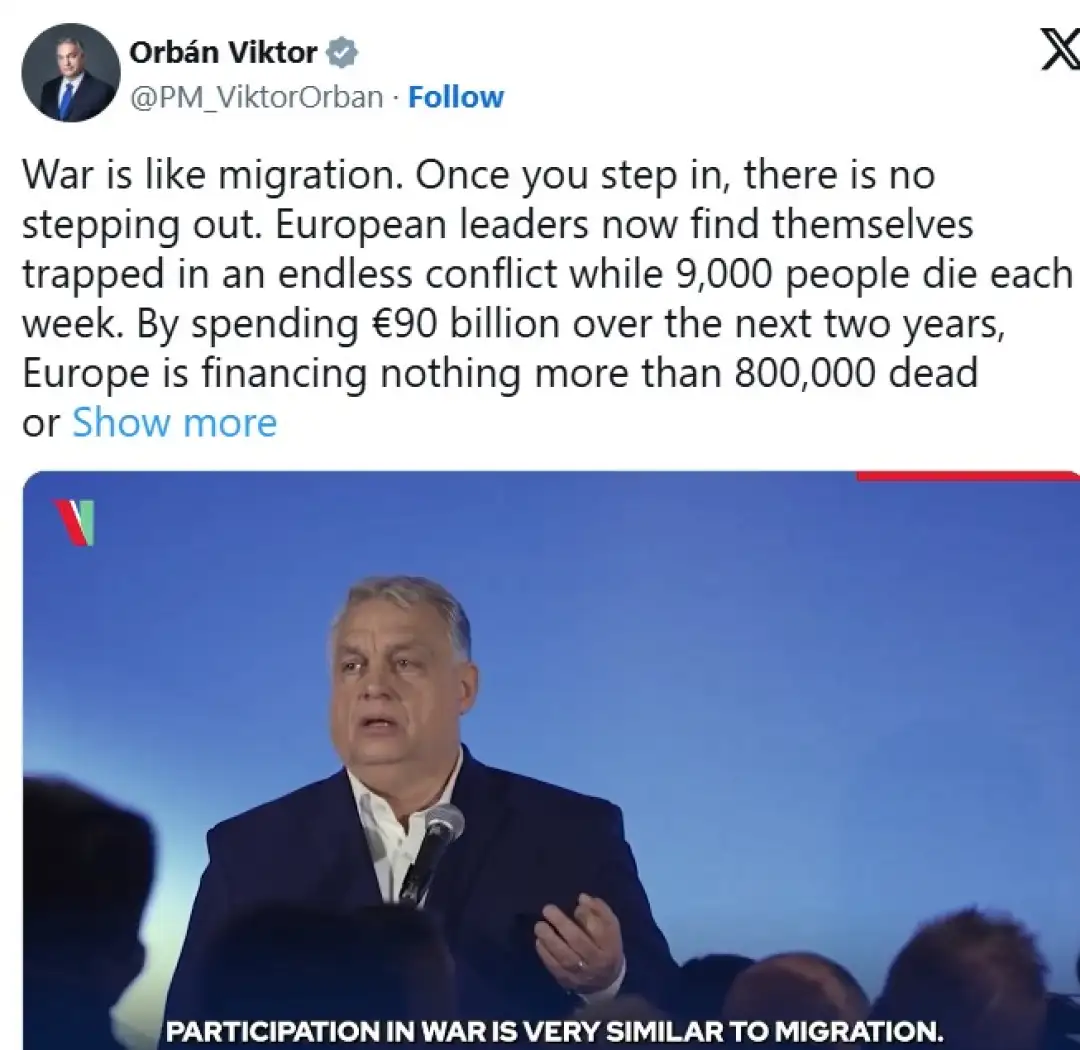 Орбан тврди дека секоја недела во конфликтот во Украина умираат околу 9.000 луѓе и дека Европа во следните две години ќе потроши околу 90 милијарди евра. Според него, со тие пари не се финансира ништо повеќе од 800.000 мртви или трајно осакатени. Тоа мора веднаш да престане“, заклучи тој.