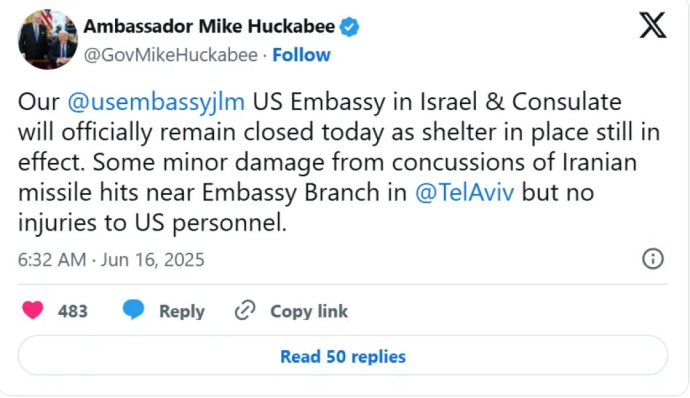 Амбасадорот на САД во Израел, Мајк Хакаби, објави дека Амбасадата и Конзулатот на САД во Израел ќе останат затворени денеска од безбедносни причини.