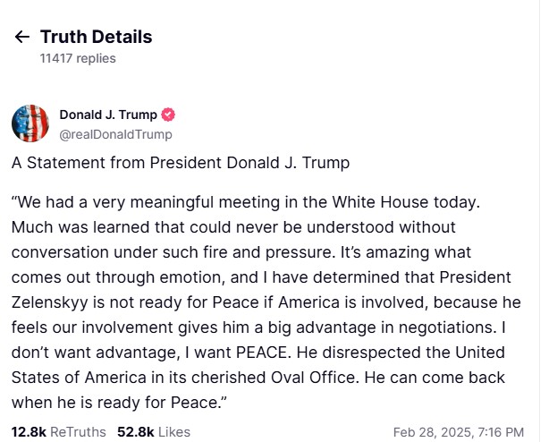 Американскиот претседател Доналд Трамп објави соопштение на својата социјална мрежа Truth Social, по скандалот во Белата куќа и неговата средба со претседателот на Украина, Володимир Зеленски.