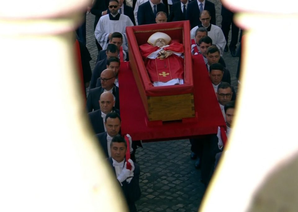 Ватикан во вторникот ги објави првите фотографии на Папата во отворен ковчег, облечен во црвена наметка, со митра на главата и бројаница во раката.