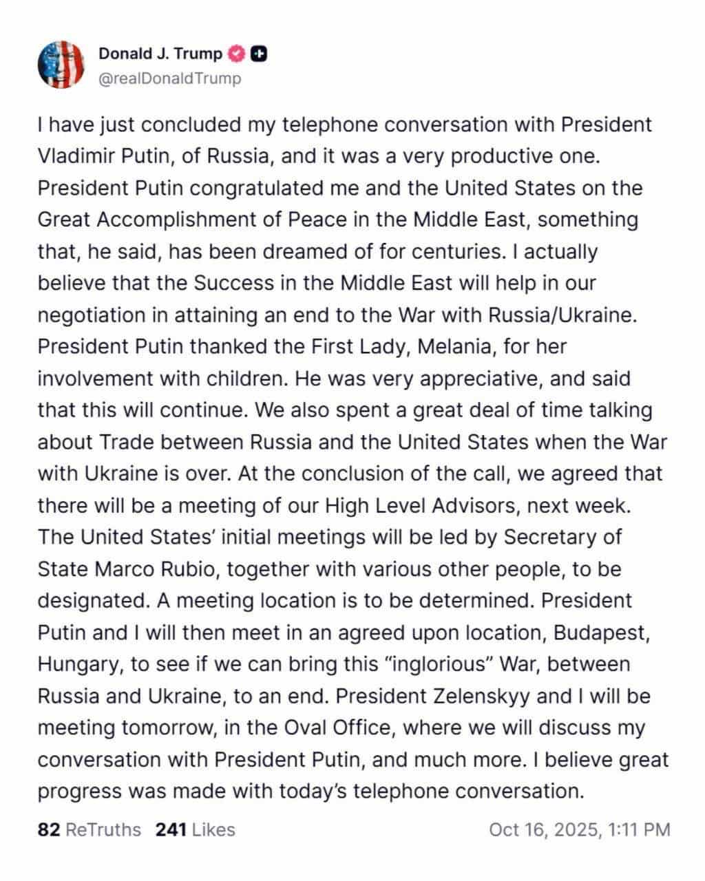 Во објава на Truth Social, Трамп рече дека тој и Путин потоа повторно ќе се сретнат во Будимпешта „за да видат дали можеме да ја завршиме оваа ‘неславна’ војна меѓу Русија и Украина“. Трамп рече дека утре ќе разговара за овој телефонски повик со украинскиот претседател Володимир Зеленски во Белата куќа, но верува дека денес е „постигнат голем напредок“.