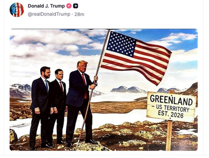 На друга фотографија, споделена денеска, Трамп е прикажан како поставува американско знаме на Гренланд, заедно со потпретседателот Џеј Ди Венс и државниот секретар Марко Рубио. На натписот стои: „Гренланд – територија на САД, основана 2026“.