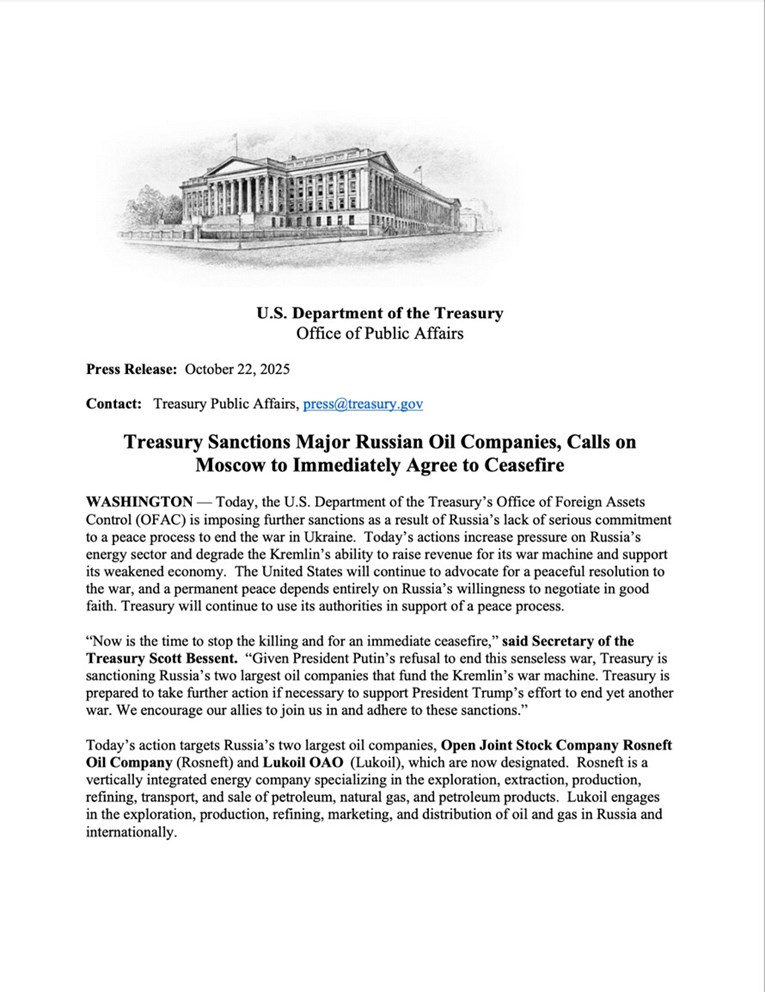 Американскиот министер за финансии Скот Бесент објасни дека санкциите се неопходни поради „упорното одбивање на Путин да го запре овој бесмислен воен конфликт“.