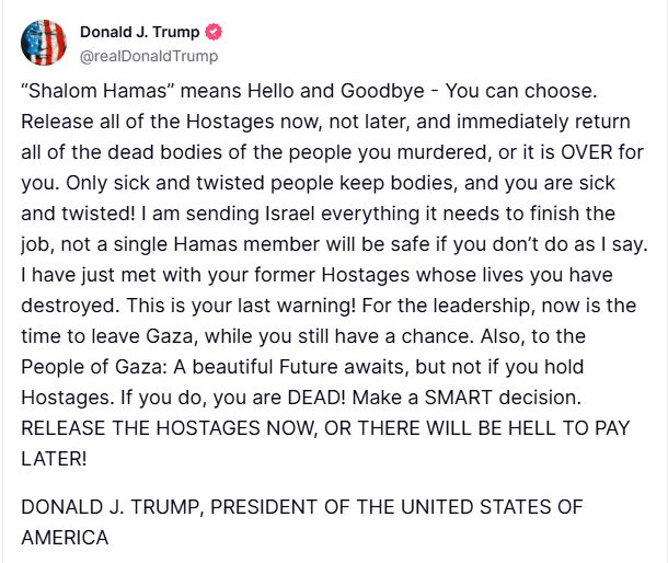 Во пораката објавена на неговата социјална мрежа „Truth Social“ вчера, Трамп побара од милитантите на Хамас веднаш да ги ослободат сите заложници кои се држат во Газа, нарекувајќи го „последно предупредување“, повикувајќи го раководството на Хамас да ја напушти палестинската енклава.