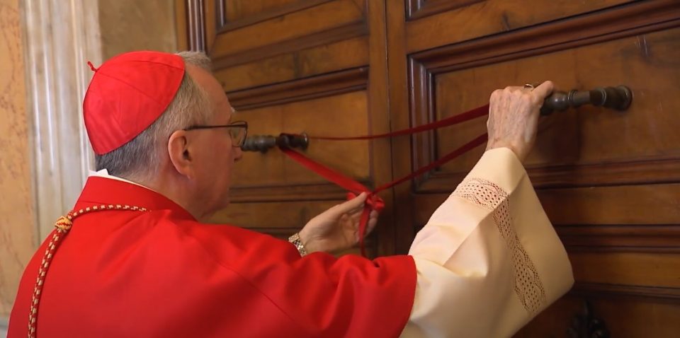 Кардиналот Кевин Фарел, кардиналот Пјетро Паролин и надбискупот Едгар Пења Пара ги запечатија вратите на папската соба во Апостолската палата и вратата од апартманот на Каса Санта Марта, каде што живееше покојниот папа Франциск.